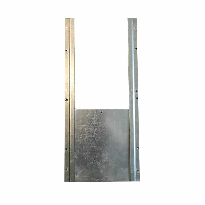 Caractéristiques : Matériau : acier galvanisé (vis et cordelette non fournies) ; Dimensions : 2 rails de 50cm de long et une trappe de 20 cm x 20cm percée. L’ouverture finale est de 16,5 cm x 20 cm ; Poids trappe seule : 500g, trappe + rails : 1,3 kg.